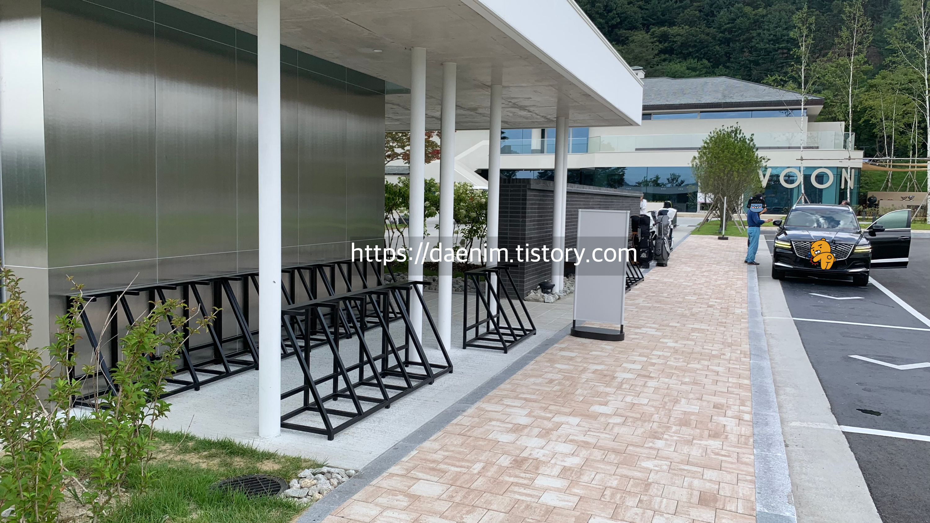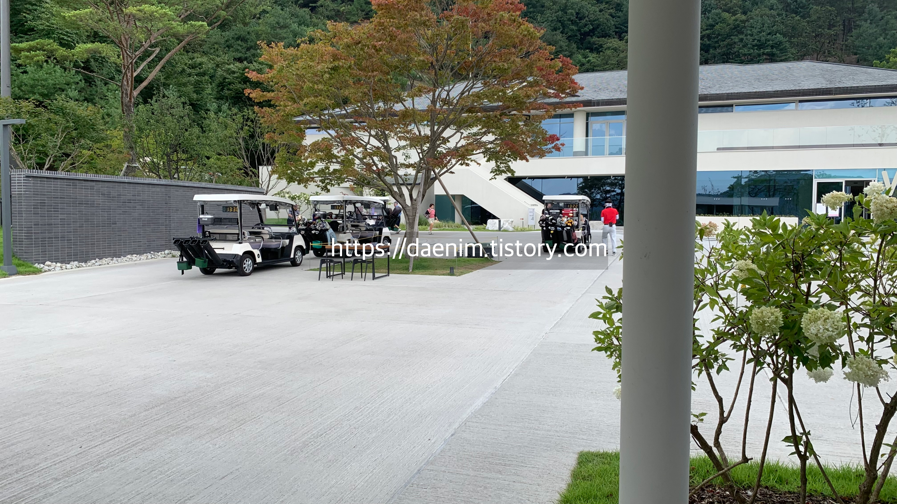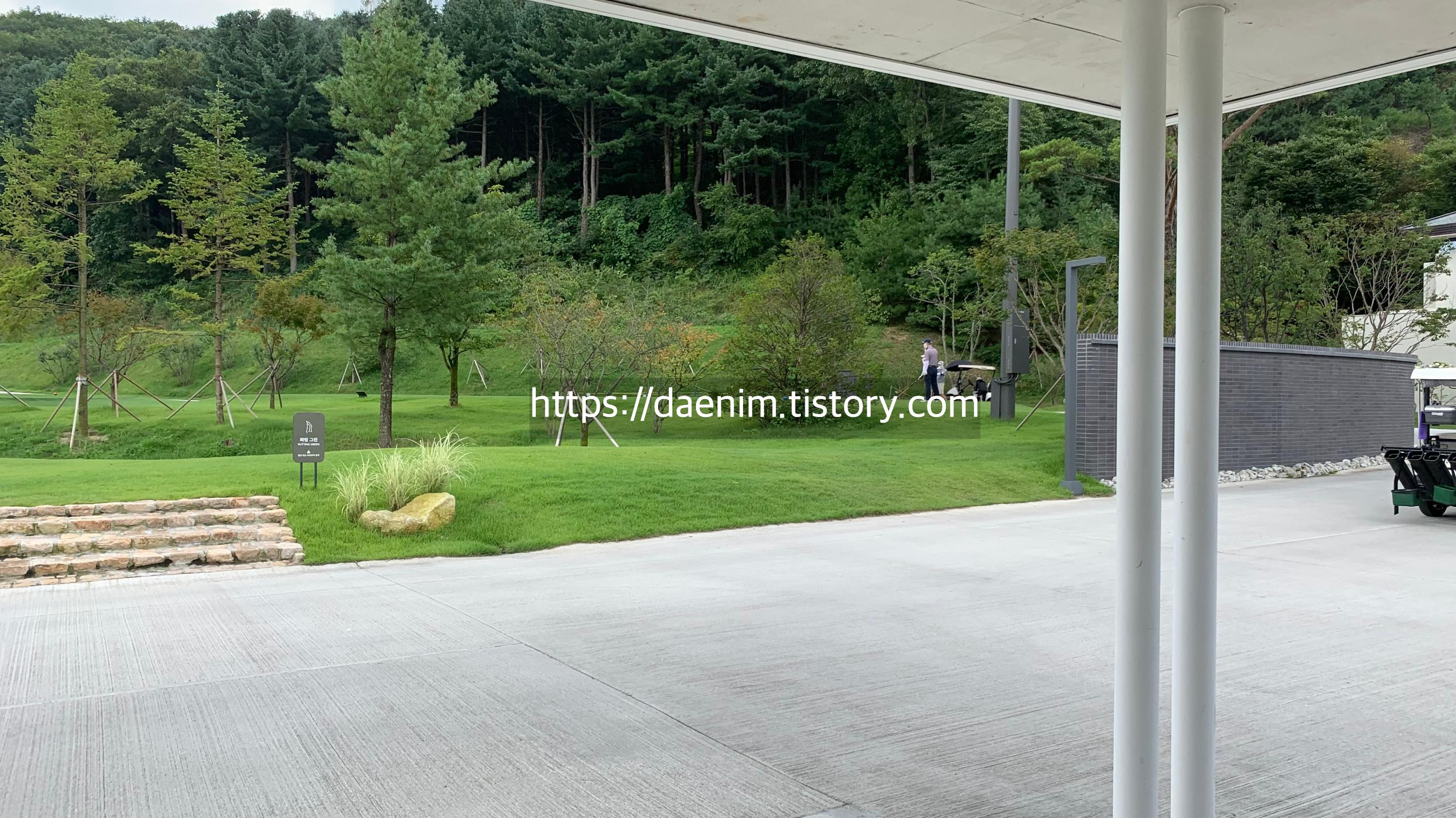 아래 사진에서와 같이 차를 타고 주차장 차단기를 지나 들어오면 캐디백을 하차 시킬 수 있는 공간이 나옵니다.